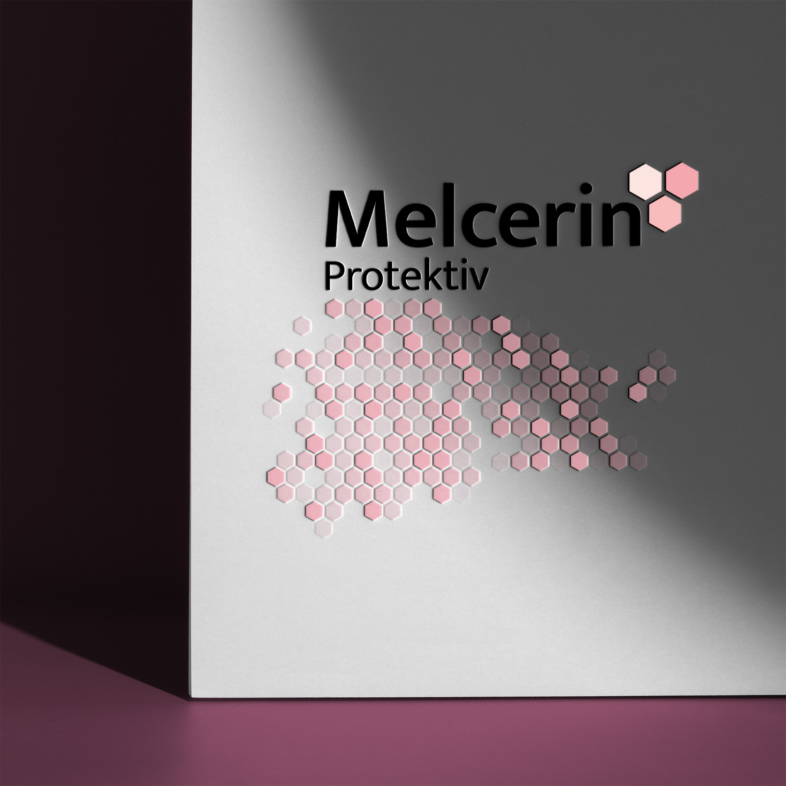 Das Logo von Melcerin Protektiv fängt mit seinen Wabenformen die Essenz seiner natürlichen Inhaltsstoffe ein. Die Waben stehen symbolisch für Bienenwachs, Honig und Propolis, die Hauptbestandteile der Intensivpflege. Ihre Anordnung und Farbgebung in sanftem Rosa verleihen dem Logo eine zarte, pflegende Anmutung, passend zur schützenden Wirkung der Salbe.